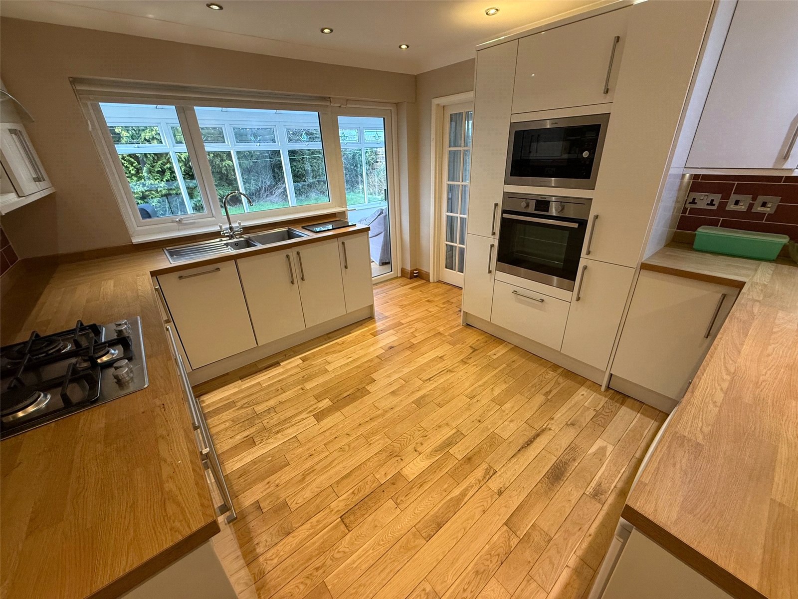 Modern kitchen including fitted wall and base units with a contrasting work surface, one and a half stainless steel sink/drainer with a mixer tap, an integrated oven, a built in microwave, four ring gas hob, extractor fan, an integrated slimline dishwasher, tiled splash back, a chrome towel heater, wood flooring, a double glazed window to the rear and a door leading to the conservatory.