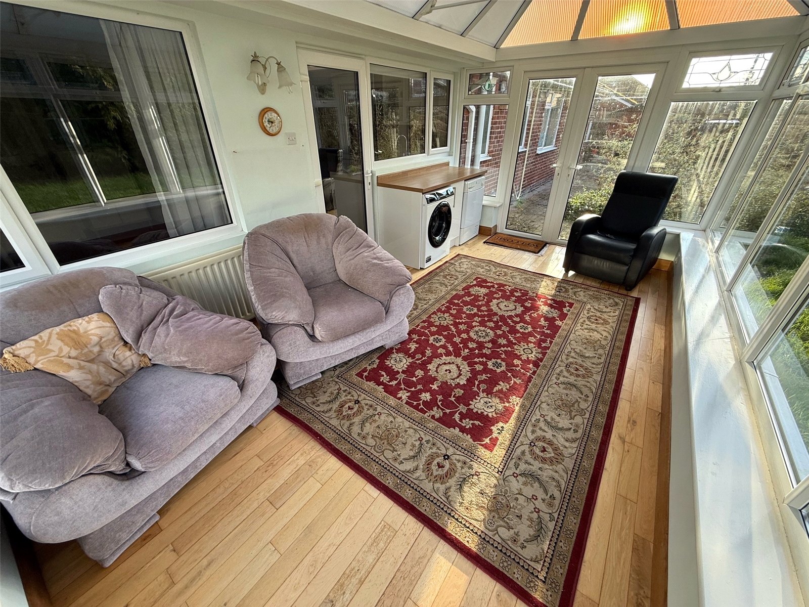 Conservatory with wood flooring, a radiator, plumbing for a washing machine, space for a tumble dryer, double glazed windows to the side and rear. French doors lead to the rear garden.