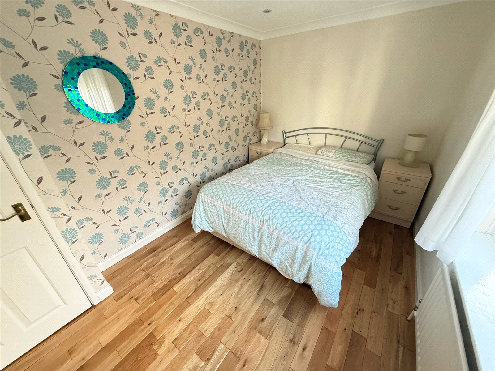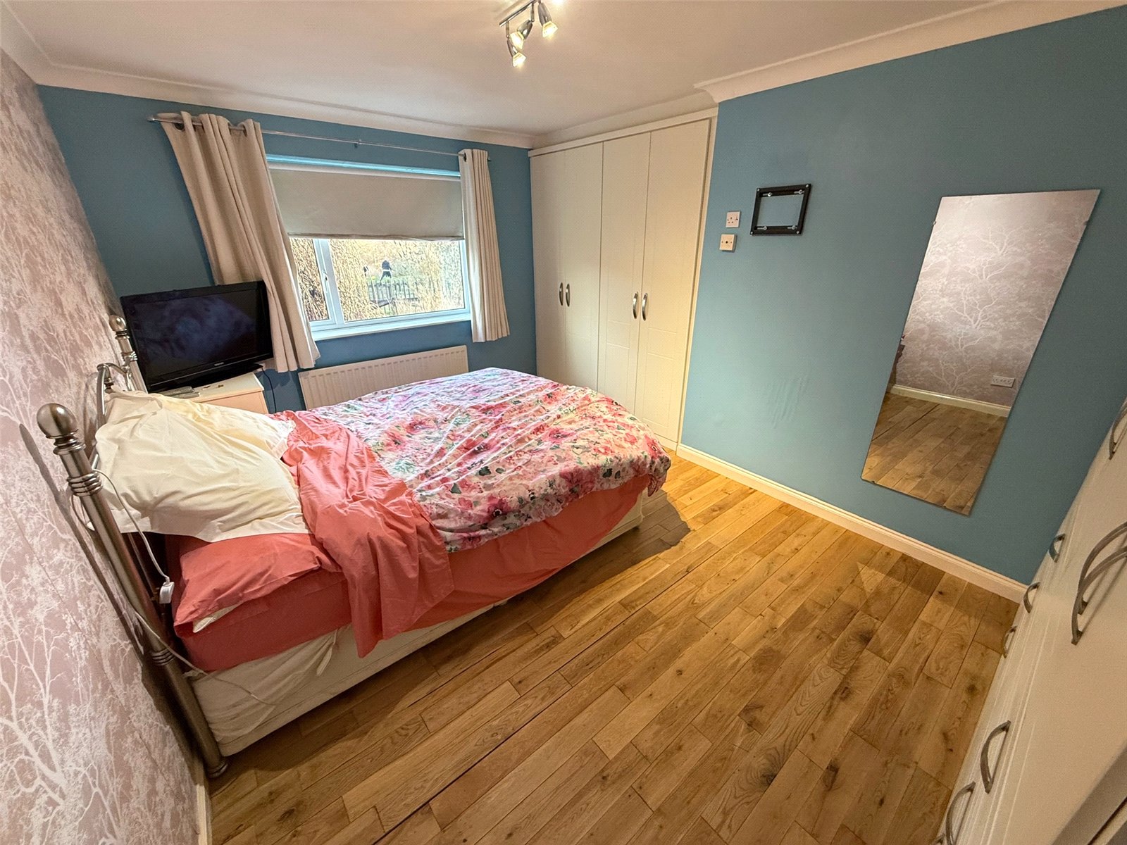 Bedroom including a built in wardrobe, wood flooring, a radiator and a double glazed window to the front.