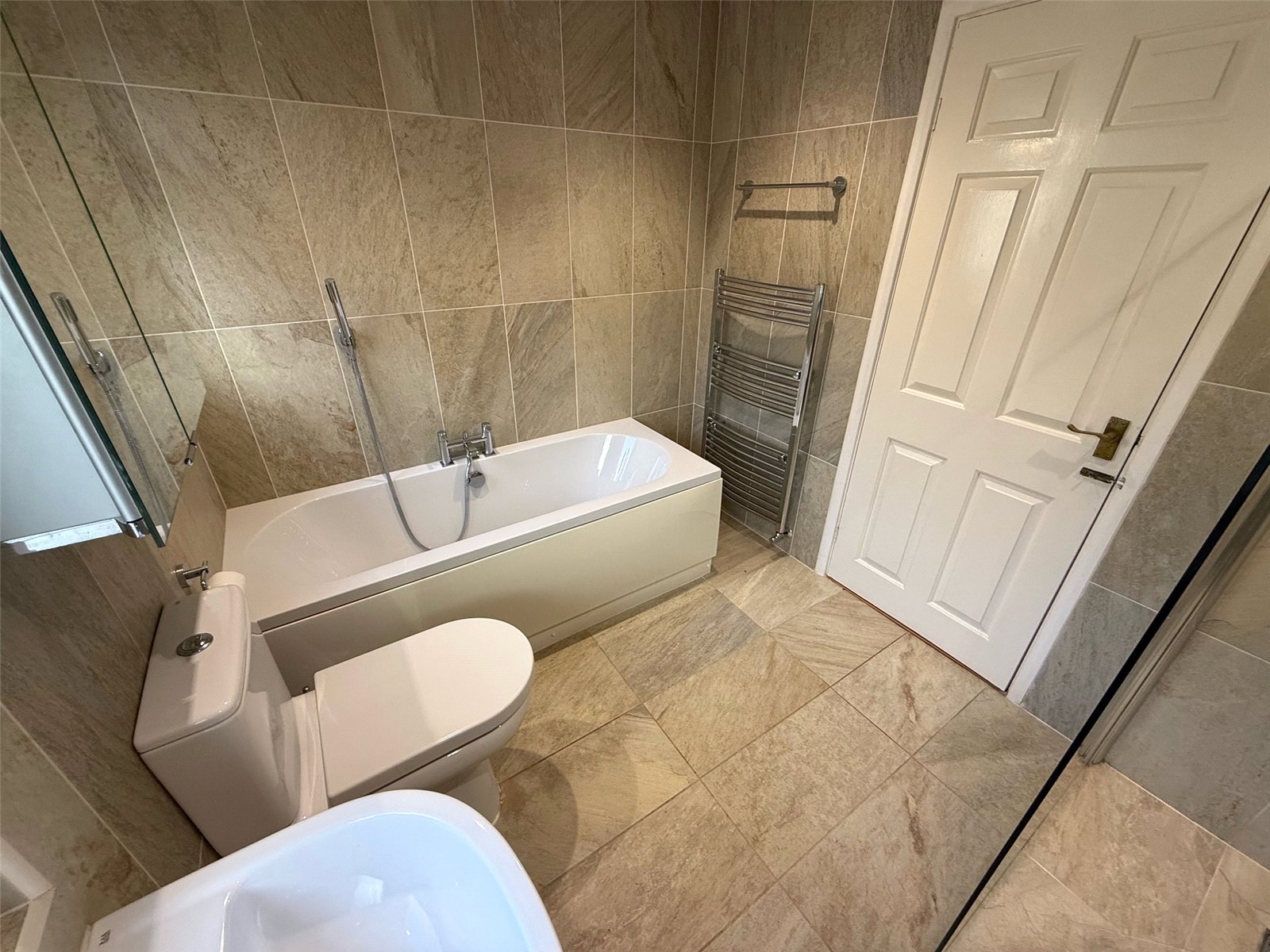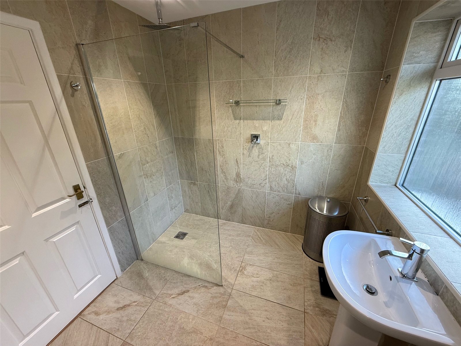 Stylish bathroom including a bath, a walk in shower, a low level WC, pedestal wash hand basin, a chrome towel heater, tiled walls, tiled flooring, two double glazed windows to the rear.