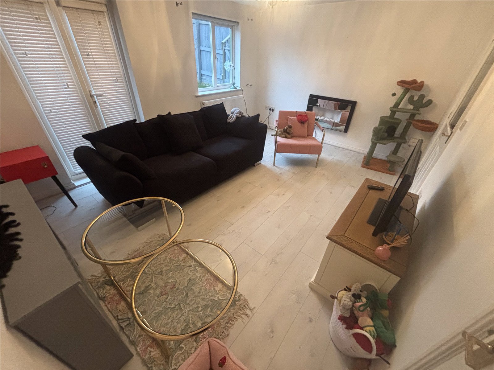 Laminate flooring with upvc double glazed window, double glazed upvc patio doors leading to the rear garden, wall mounted radiator, wall mounted electric fire.