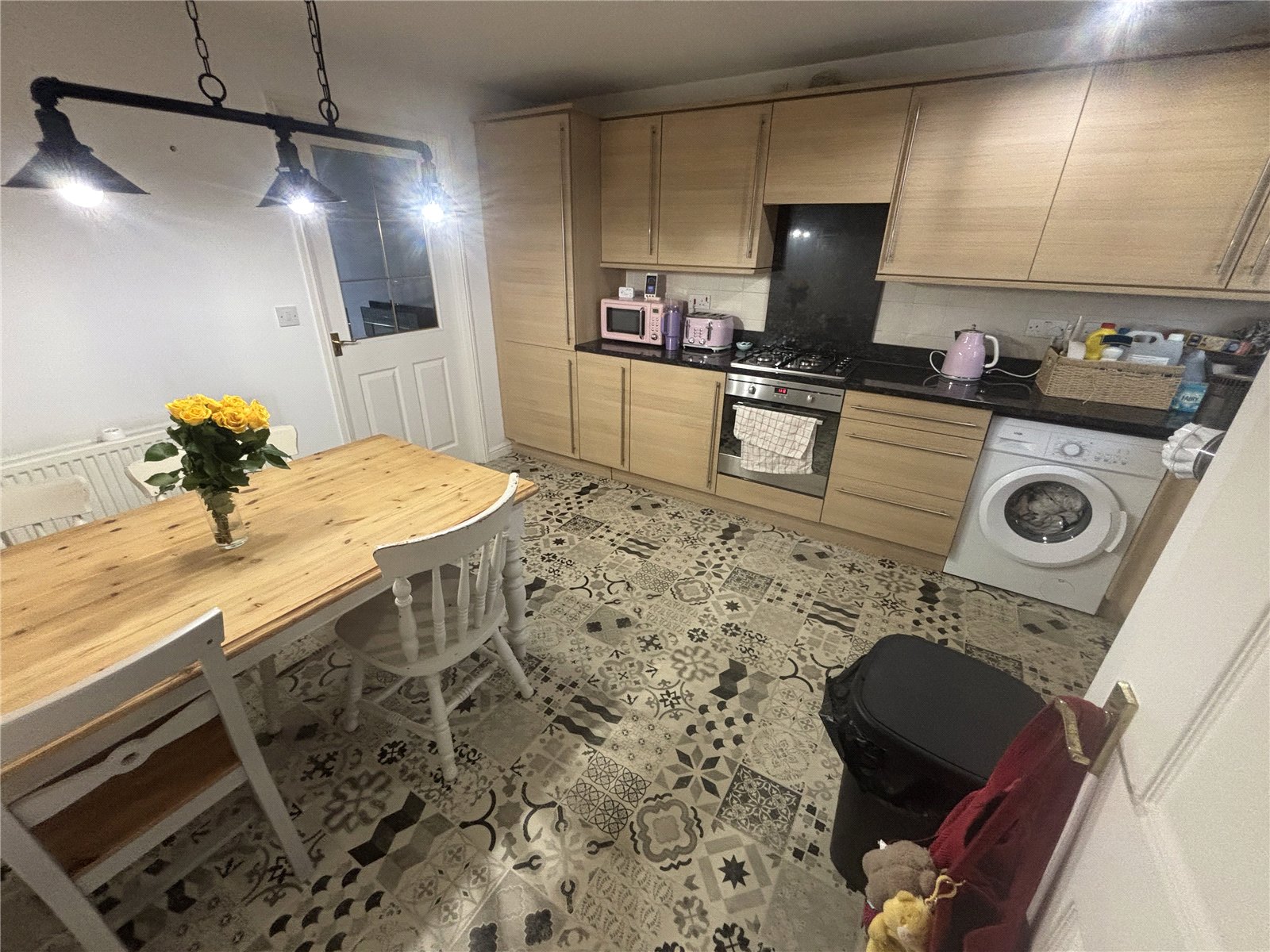 Modern tiled effect flooring with a range of wall and bass units and roll top work surface, stainless steel sink and drainer unit, Gas hob and electric oven, Intergrated fridge and freezer, upvc double glazed window and wall mounted radiator.