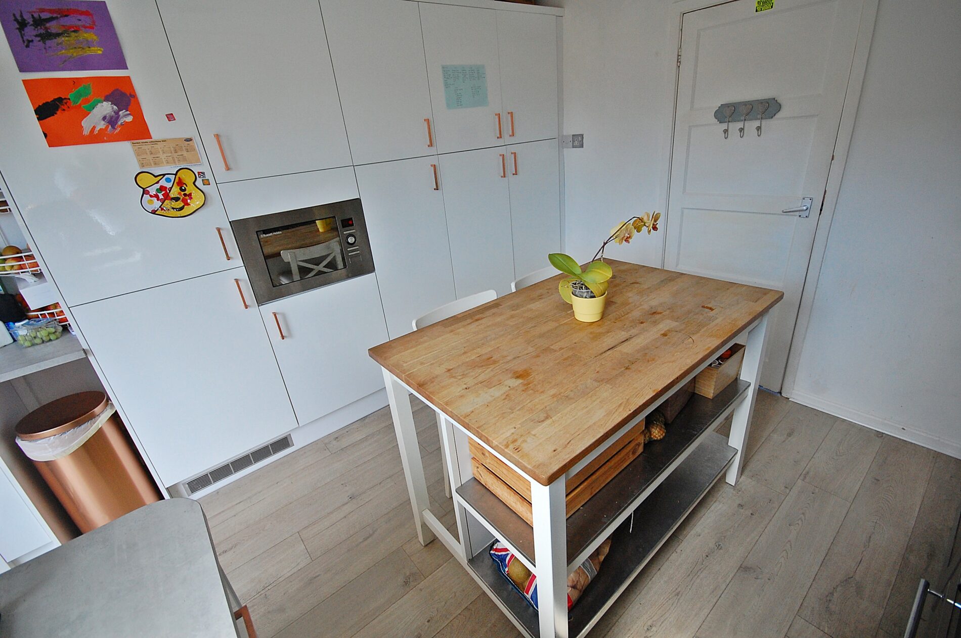 Stunning modern kitchen including fitted wall and base units with a contrasting work surface, copper sink with mixer tap, range master cooker, integrated fridge/freezer, a dishwasher, an integrated microwave, tiled splash back, laminate flooring and a double glazed window to the rear.