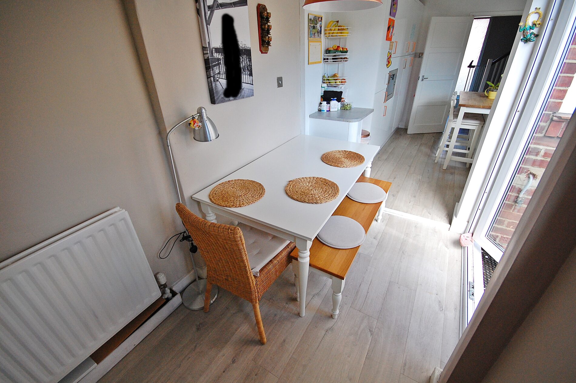 The dining area includes laminate flooring, a radiator and French doors leading to the rear garden.