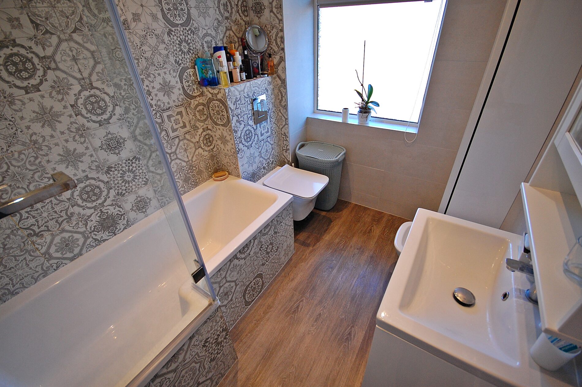 Stylish bathroom including a bath with mains shower above, low level WC, wash hand basin, bidet, tiled walls, a radiator and a double glazed window to the front.