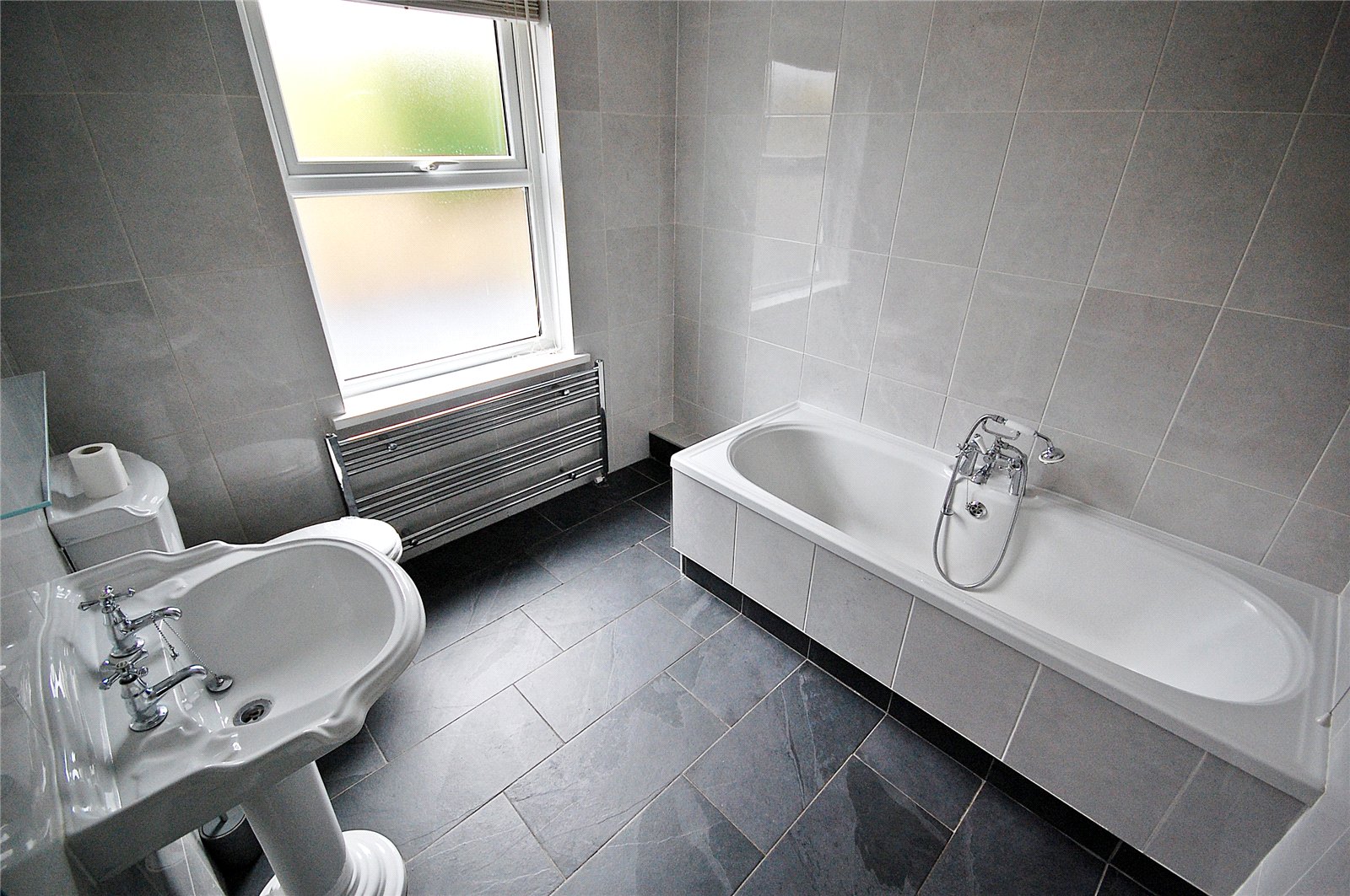 Stylish bathroom including a bath, shower cubicle with an electric shower, low level WC, pedestal wash hand basin, tiled flooring, tiled walls, chrome towel heater and a double glazed window to the front.