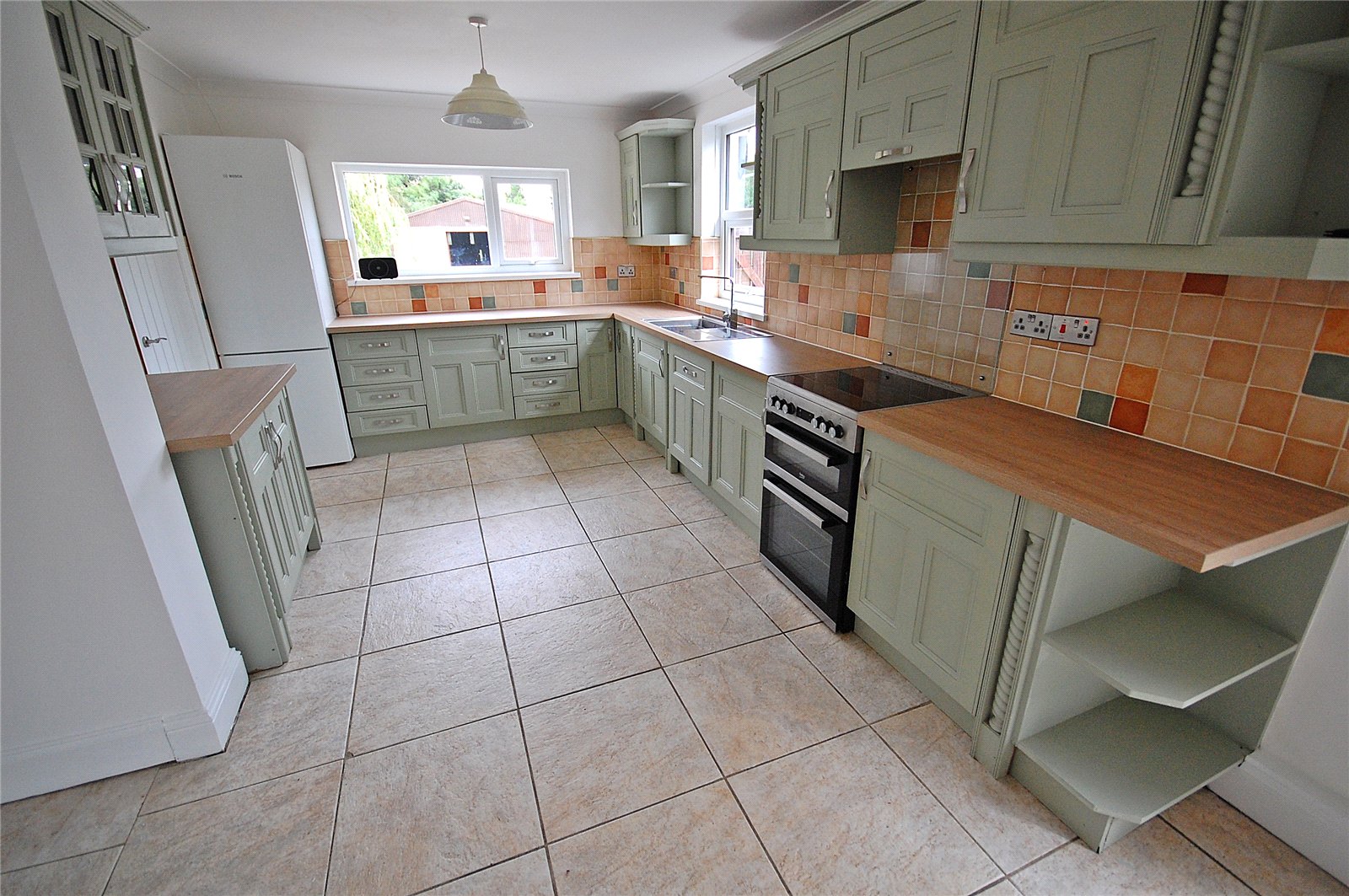 Kitchen including fitted wall and base units with a contrasting work surface, stainless steel sink/drainer with a mixer tap, free standing electric double oven with four ring electric hob above, an integrated dishwasher, tiled splash back, tiled flooring, double glazed windows to the front and side.