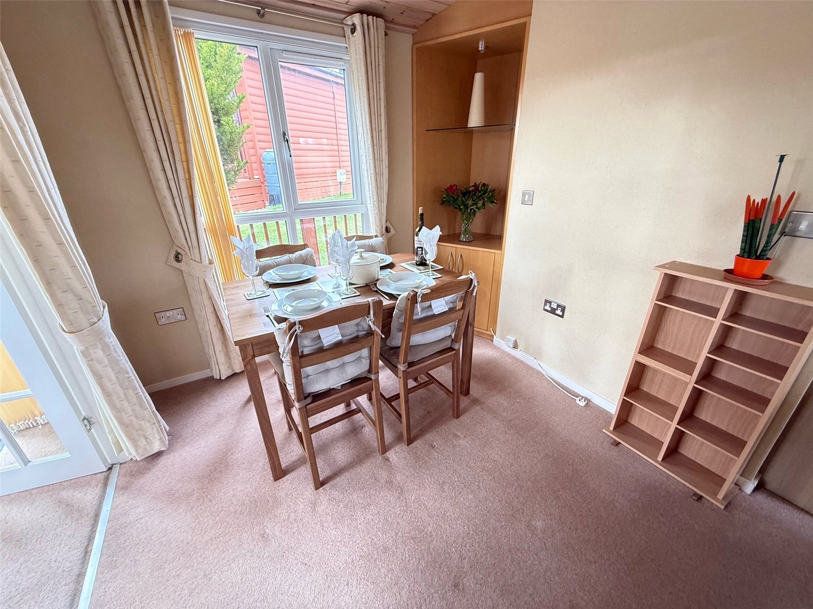 Dining area including carpet flooring and a double glazed window to the front.