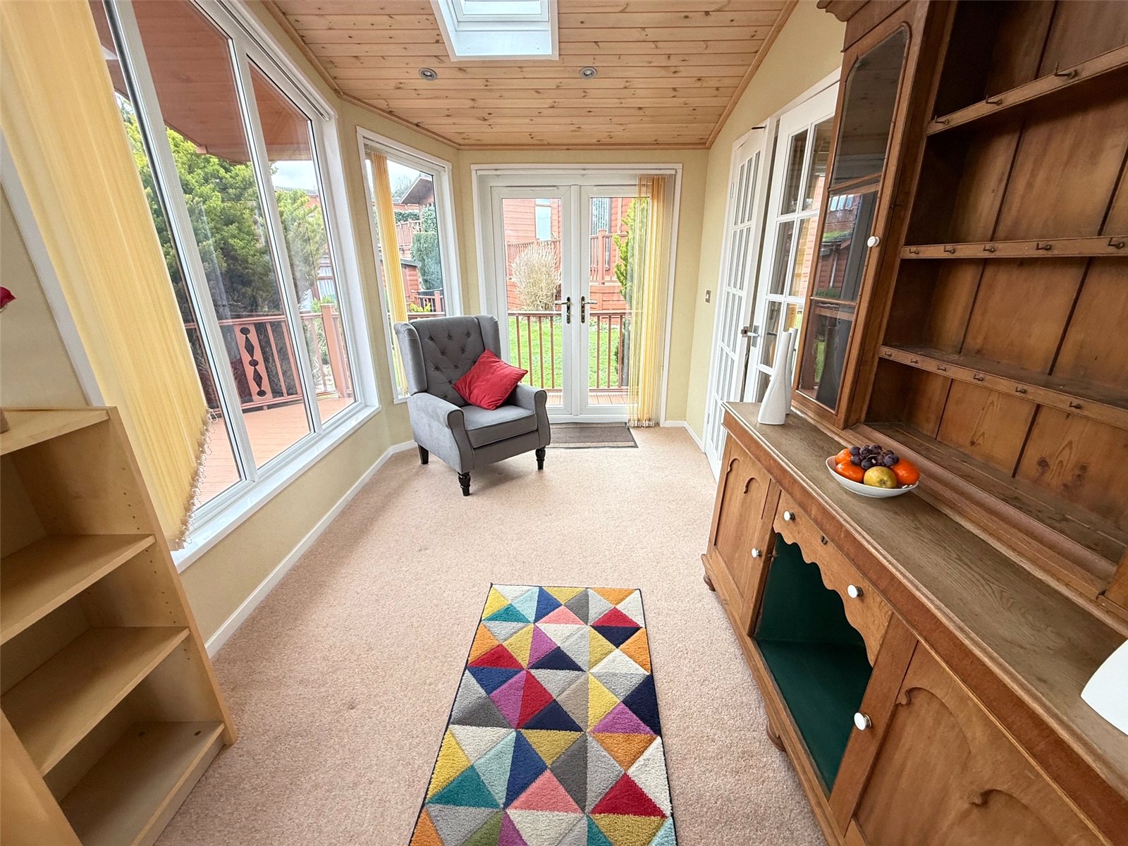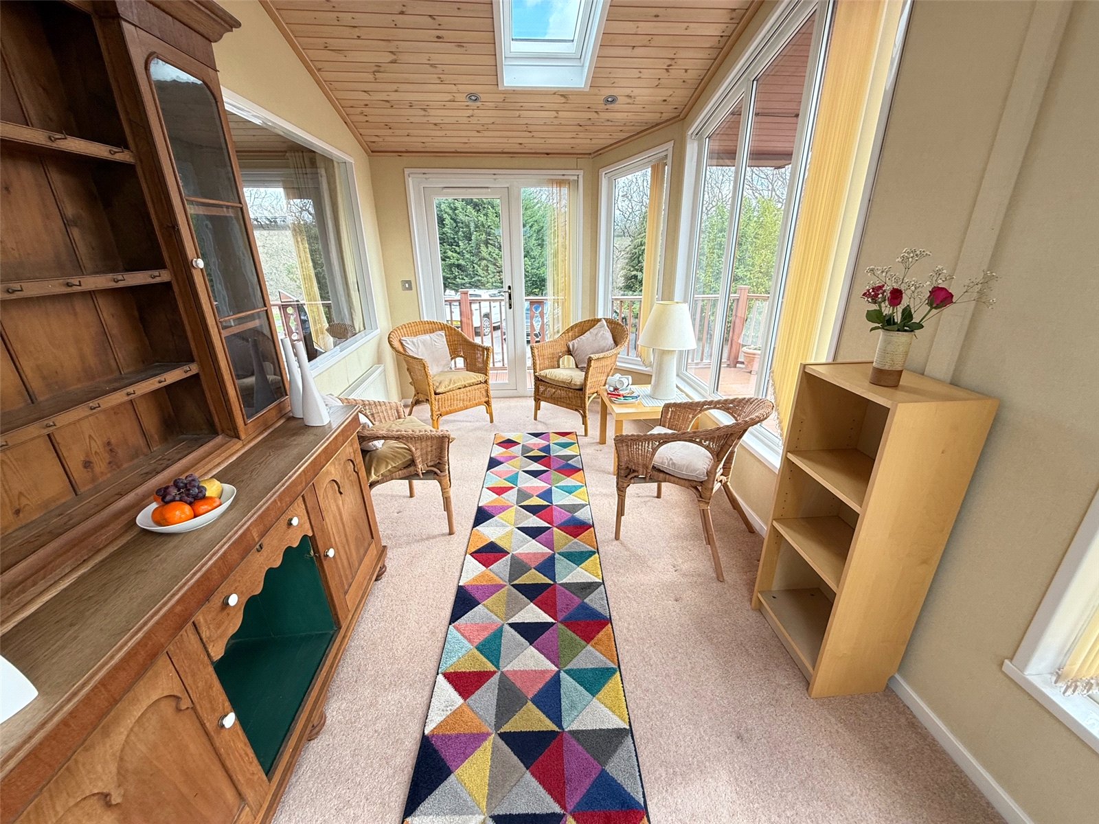 Sun room including carpet flooring, a radiator, two Velux windows, double glazed windows to the front, side and rear. There are also doors to the front and rear leading to the decking.