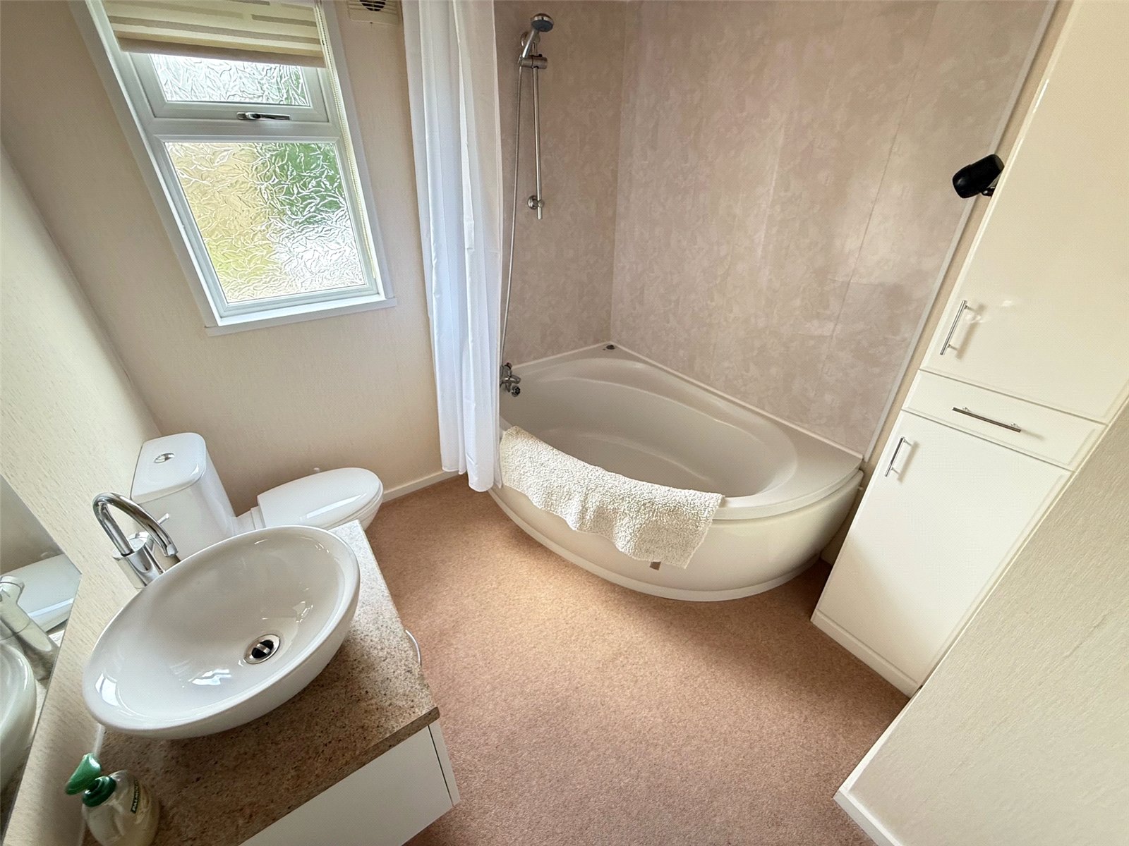 Bathroom including a bath with shower above, low level WC, wash hand basin, towel heater, carpet flooring, a built in cupboard, an extractor fan and a double glazed window to the rear.