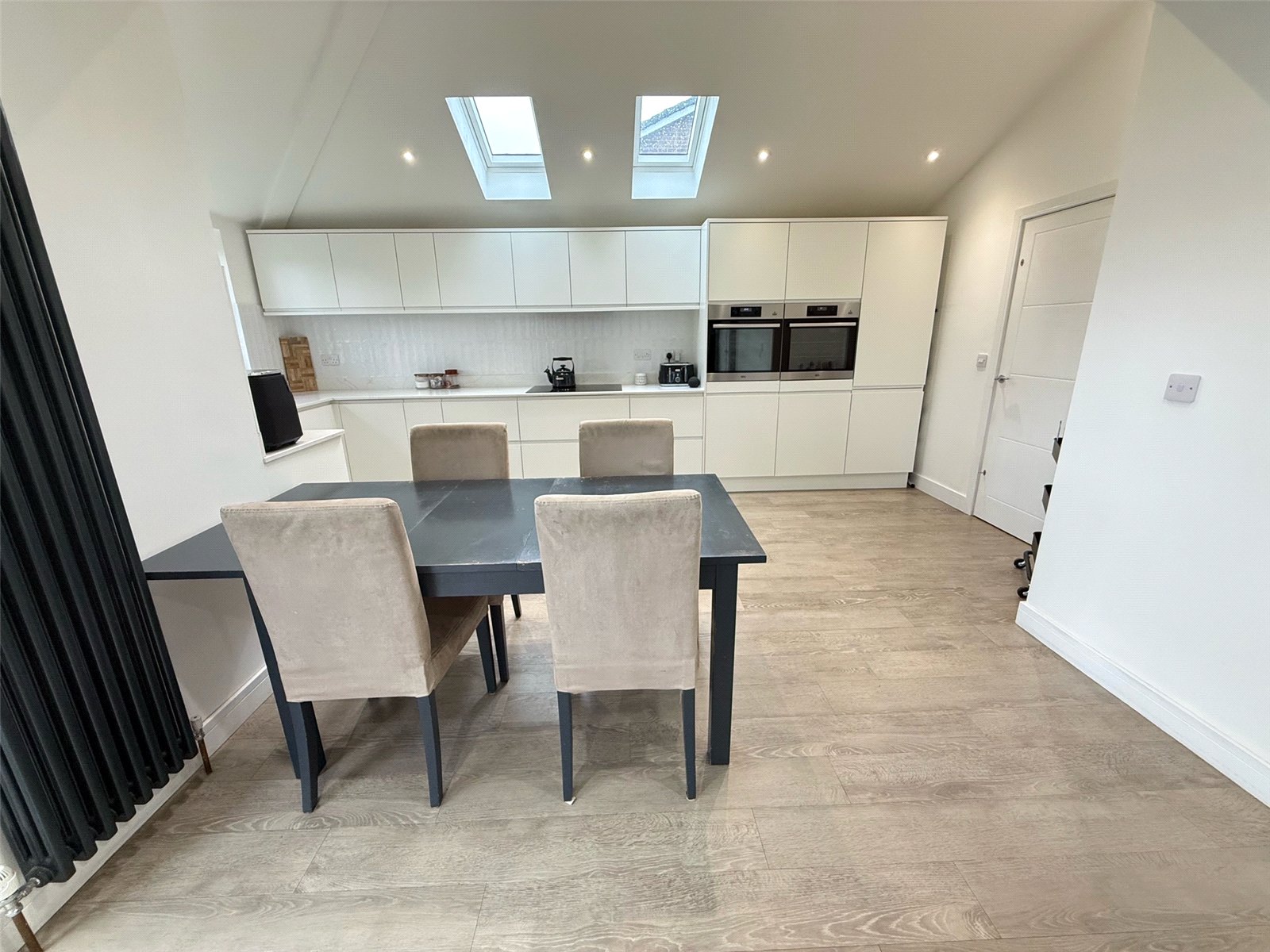 Modern kitchen including fitted wall and base units with a Quartz work surface, sink with a mixer tap, two built in AEG ovens, induction hob with extractor fan above, an integrated fridge/freezer, an integrated dishwasher, tiled splash back, Karndean flooring, two Velux windows, a double glazed window to the rear and a patio door leading to the rear garden.