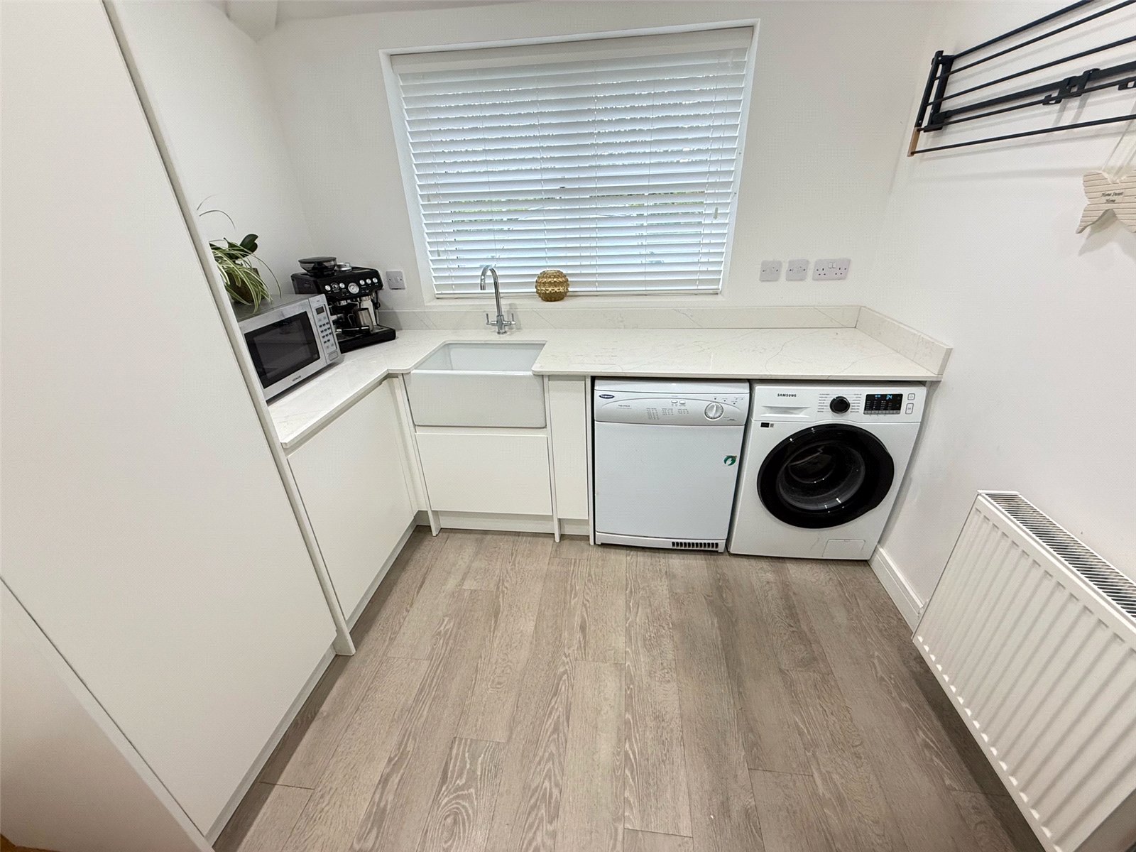 Utility room including fitted wall and base units with a Quartz work surface, Belfast sink. plumbing for a washing machine, space for tumble dryer, cupboard housing the boiler, a radiator, a double glazed window to the front and a door leading to the side.