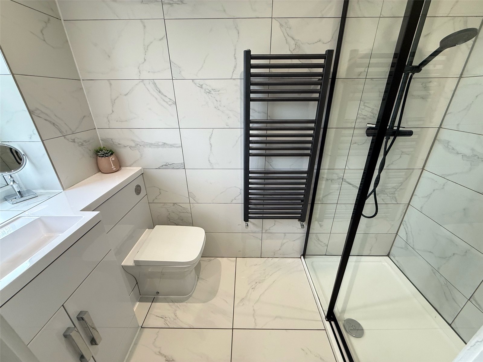 Including a shower cubicle with a mains shower, low level WC, wash hand basin, tiled flooring, tiled walls, towel heater, an extractor fan and a double glazed window to the rear.