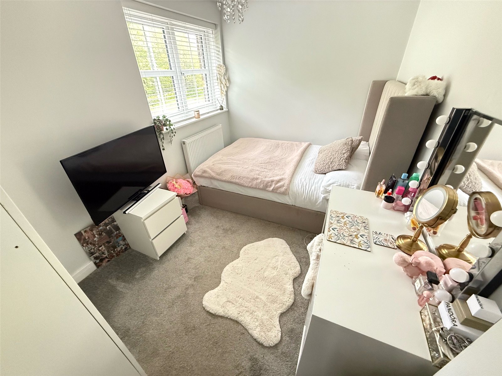 Bedroom with carpet flooring, a radiator and a double glazed window to the front.