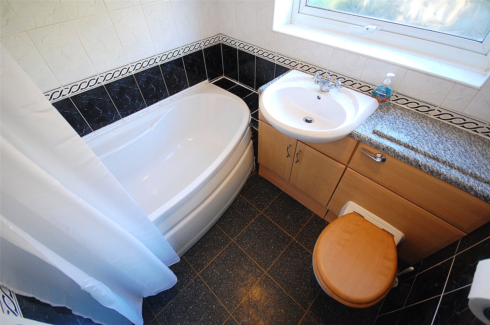 Including a bath with an electric shower above, a low level WC, a wash hand basin, tiled walls, tiled flooring, a radiator and a double glazed window to the rear.