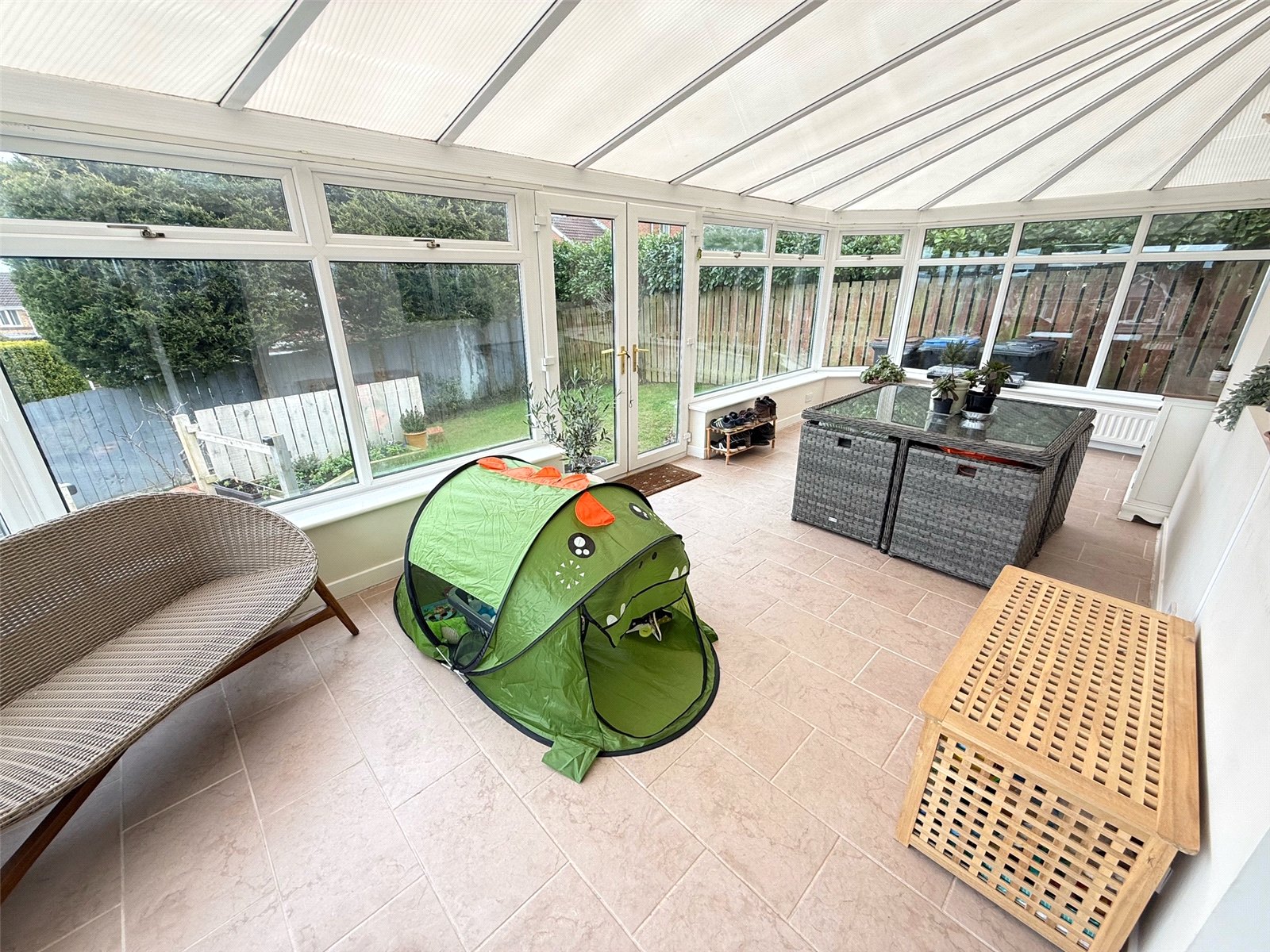 Large conservatory including tiled flooring with under floor heating, two radiators, double glazed windows to the side and rear. There are French doors leading to the rear garden.