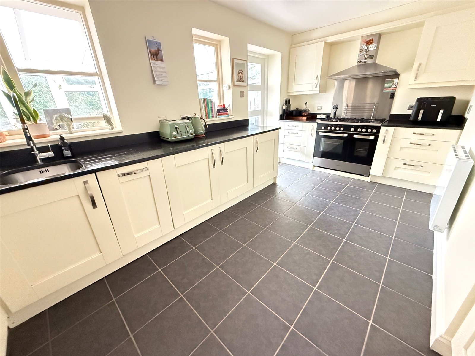 Kitchen including fitted wall and base units with a contrasting Quartz work surface, sink with a mixer tap, a range cooker, wine fridge, integrated slimline dishwasher, an integrated washing machine, an integrated fridge, an integrated freezer, tiled flooring, an electric heater, two single glazed windows to the rear and a door leading to the conservatory.