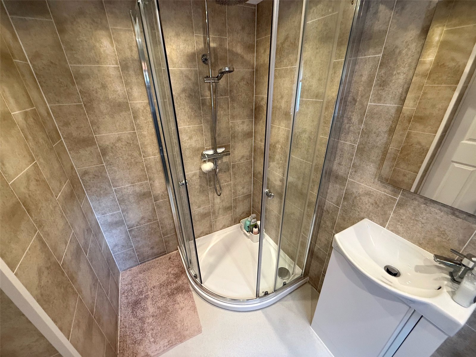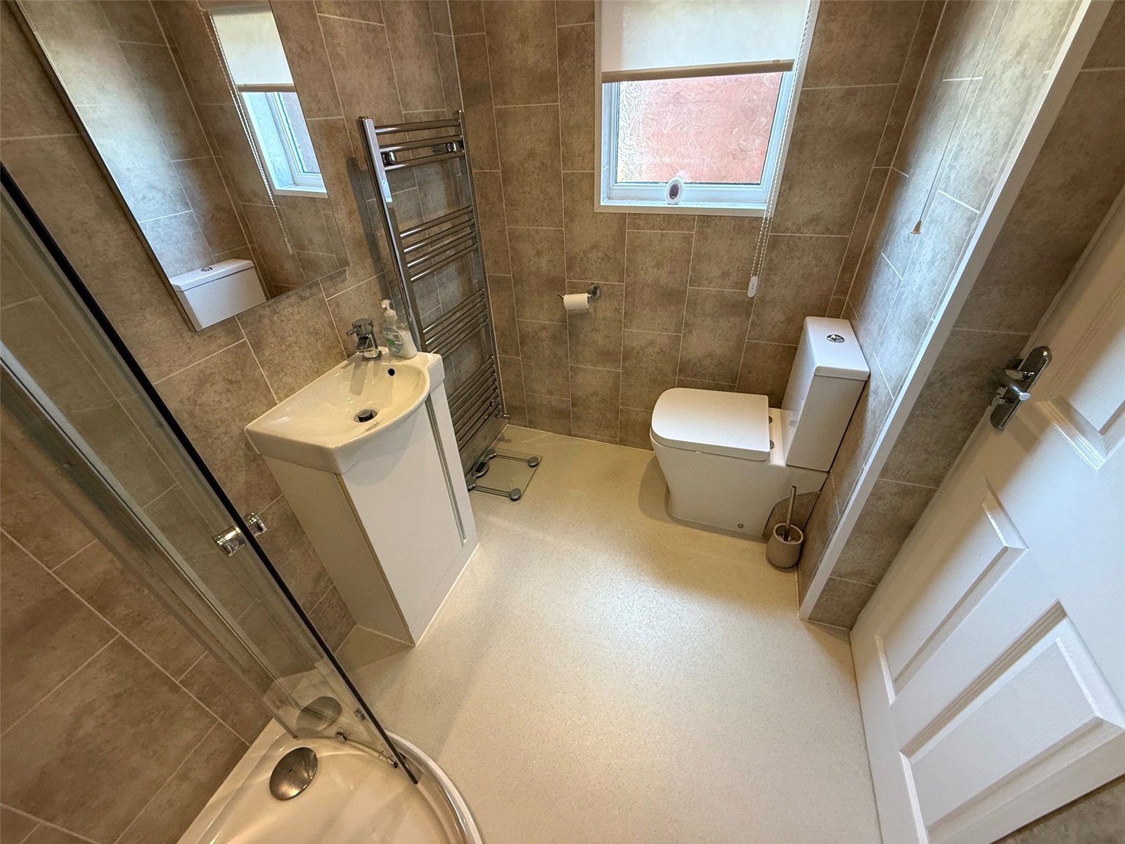Including a shower cubicle with a mains shower, low level WC, wash hand basin, chrome towel heater, an extractor fan, vinyl flooring and a double glazed window to the side.
