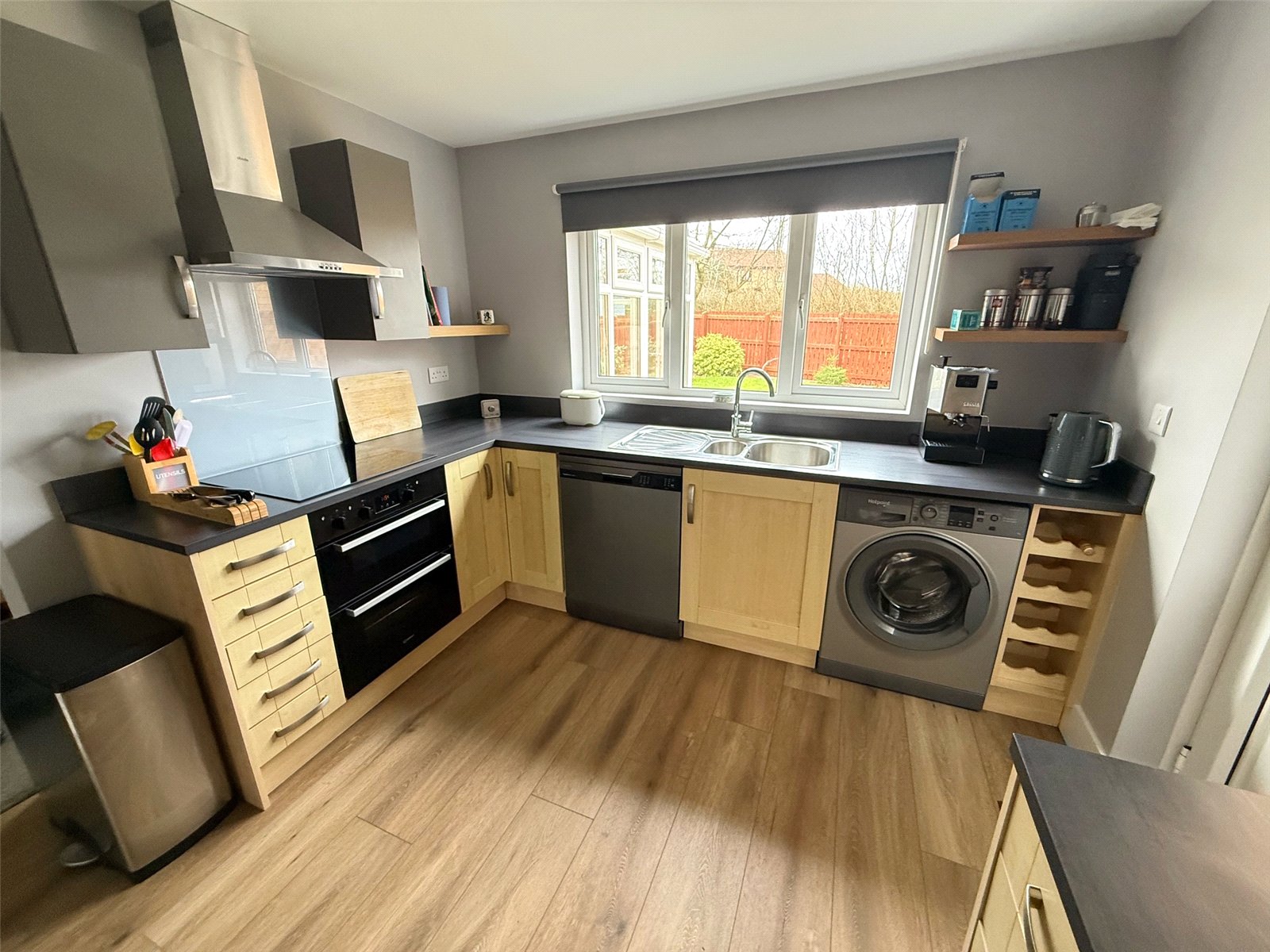Kitchen including fitted wall and base units with a contrasting work surface, one and a half stainless steel sink/drainer with a mixer tap, an integrated double oven, four ring ceramic hob, extractor fan, plumbing for a washing machine, plumbing for a dishwasher, LVT flooring, a double glazed window to the rear and a door leading to the side of the property.