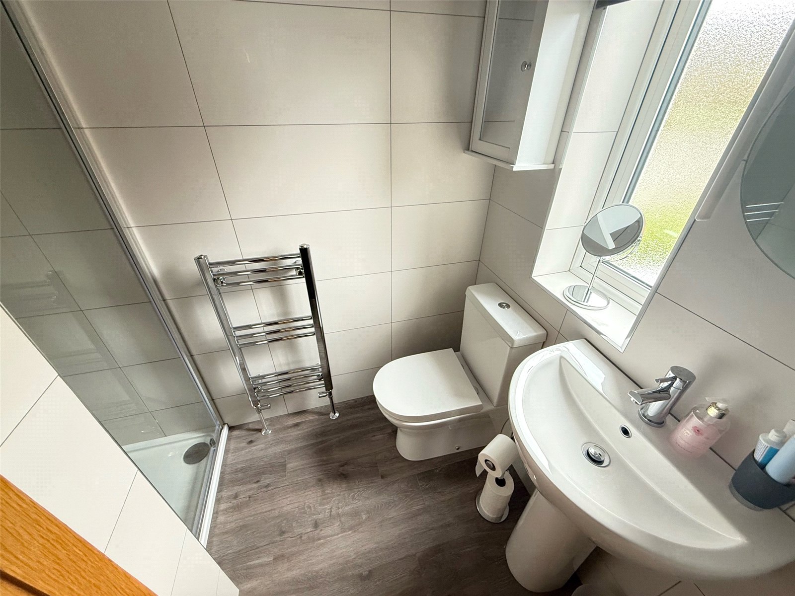 With a shower cubicle with a mains shower, low level WC, pedestal wash hand basin, chrome towel heater, tiled flooring and a double glazed window to the side.