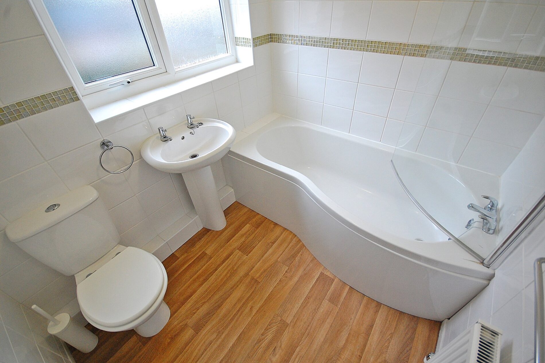 Bathroom including a bath with mains shower above, low level WC, pedestal wash hand basin, tiled walls, vinyl flooring, an extractor fan, a radiator and a double glazed window to the rear.