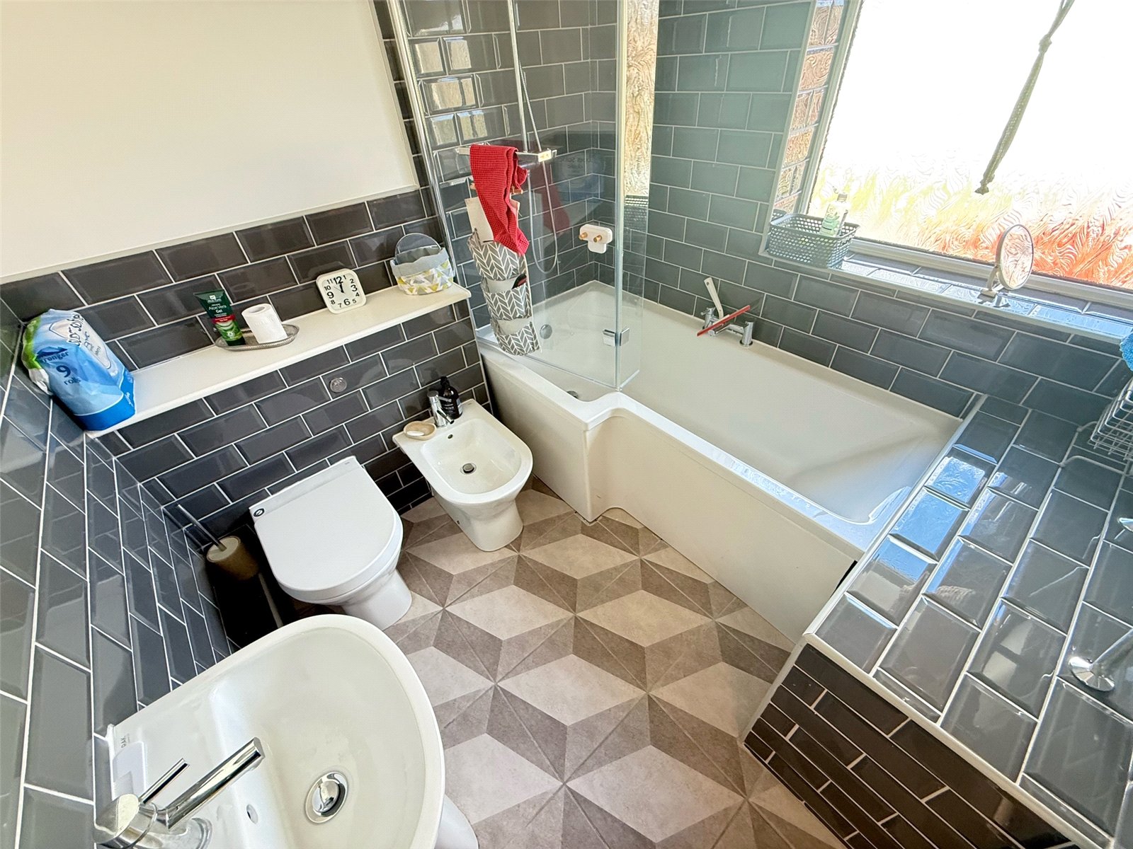 Stylish bathroom including a bath with a mains shower above, low level WC, bidet, pedestal wash hand basin, chrome towel heater, tiled flooring, partially tiled walls and a double glazed window to the front.