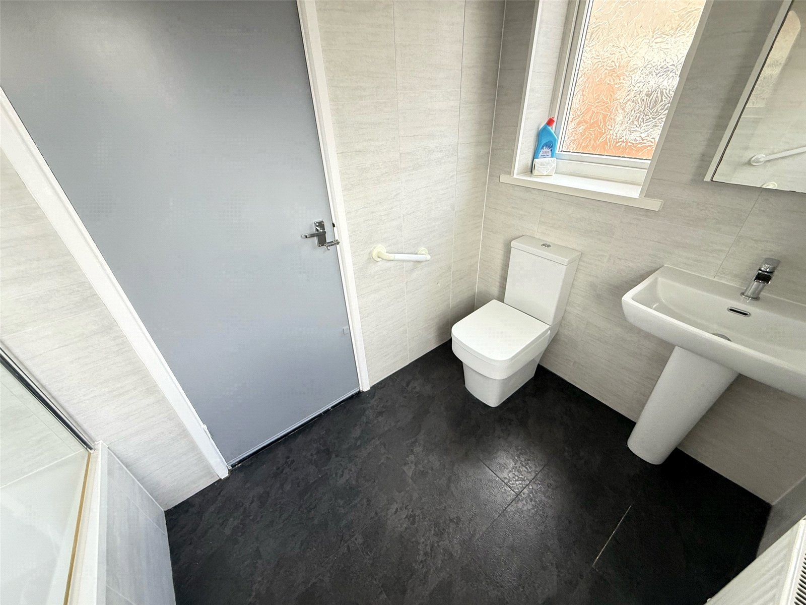 Including a low level WC, wash hand basin, a radiator, vinyl flooring and a double glazed window to the side.